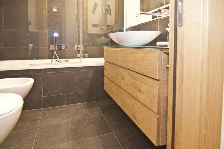 Per la zona giorno si è scelto il rovere, che con l'assenza di nodi, contribuisce alla modernità e sobrietà dell'insieme, pur restituendo una forte sensazione di calore. La scelta per le stanze è ricaduta invece sul cirmolo, che con il suo caratteristico profumo è tradizionalemtne riconosciuto per favorire il riposo. Il rivestimento delle pareti nasconde ampie armadiature a muro, perfettamente integrate. Lo stesso legno e la stessa lavorazione sono stati impiegati nella cucina. Grande attenzione è stata dedicata a quell'angolo del salotto che si sviluppa sotto la falda del tetto: è stato realizzato un divano con profondità doppia, quasi un "lettone", sottolienato anche dal rivestimento a materasso.